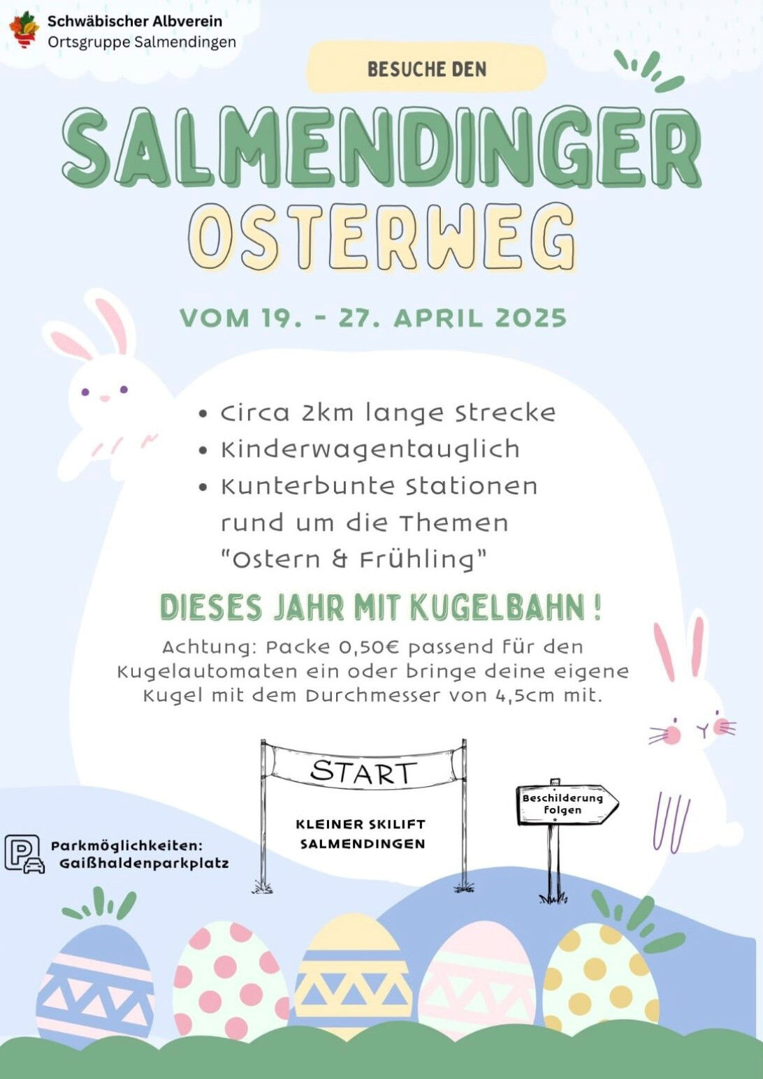 Vom 19. bis 04. Mai 2025 lädt der Osterweg in Salmendingen zu einem fröhlichen Spaziergang durch den Frühling ein. Überall entlang des Weges warten kleine Überraschungen – von bunten Rätseln über kreative Spiele bis hin zum Blumen säen ist alles dabei. Ob knifflig, spielerisch und bewegungsreich - hier ist für jedes Alter etwas geboten. Ein besonderes Highlight wartet mit der Kugelbahn – Bitte daran denken: 0,50 € für den Kugelautomaten mitbringen oder eine eigene Kugel mit 4,5 cm Durchmesser einpacken. Der Weg ist kinderwagentauglich und damit auch für die Kleinsten gut geeignet.