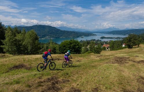 The Krumpendorfer Panoramarunde is marked as a circular route from the park pool. The approximately 16km | 400 hm route leads along country and forest roads, hiking trails and single trails, mostly along the Krumpendorf municipal borders.The starting point is at the Krumpendorf park pool. At the beginning, it goes along the cycle path and on an asphalt country road towards Görtschach. At the end of the village, when entering the forest, narrow forest and hiking trails begin to Nussberg. From there, after a sharp left turn, it goes a bit along the asphalt road towards Hohenfeld. A well-adapted forest path now leads through the forest to Hohenfeld. Please be a little careful here, because the main road has to be crossed shortly after the exit from the "Kollehof". Past the Wirtnigteich, it goes on a narrow field path to Pirk, from where the connecting path to the Pörtschacher Bannwaldtour is signposted. From Pirk, a well-traveled forest path leads towards Pirk. After a short, flat forest section - before the last stretch to the Pirkerkogel - you are rewarded with a wonderful view of Lake Wörthersee and the surrounding mountains. The last climb now leads to the Pirkerkogel. The route does not lead directly to the summit of the Kogel, but it is easily accessible with a small deviation and offers further views of the lake, the Maria Wörth peninsula and the Pyramidenkogel. Now it's time to use the brakes, because it's only downhill back towards Krumpendorf Ort. At the Bürger Mostpresse you come back onto the main road. At the traffic lights you go straight on over Kochstraße into Pamperlallee, back to the starting point Parkbad. Please watch out for hikers and walkers on the way! We wish you lots of strength and joy in your calves at Lake Wörthersee!