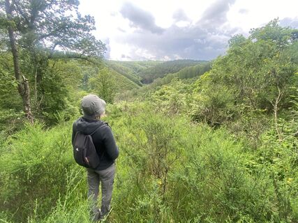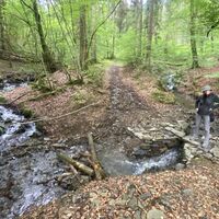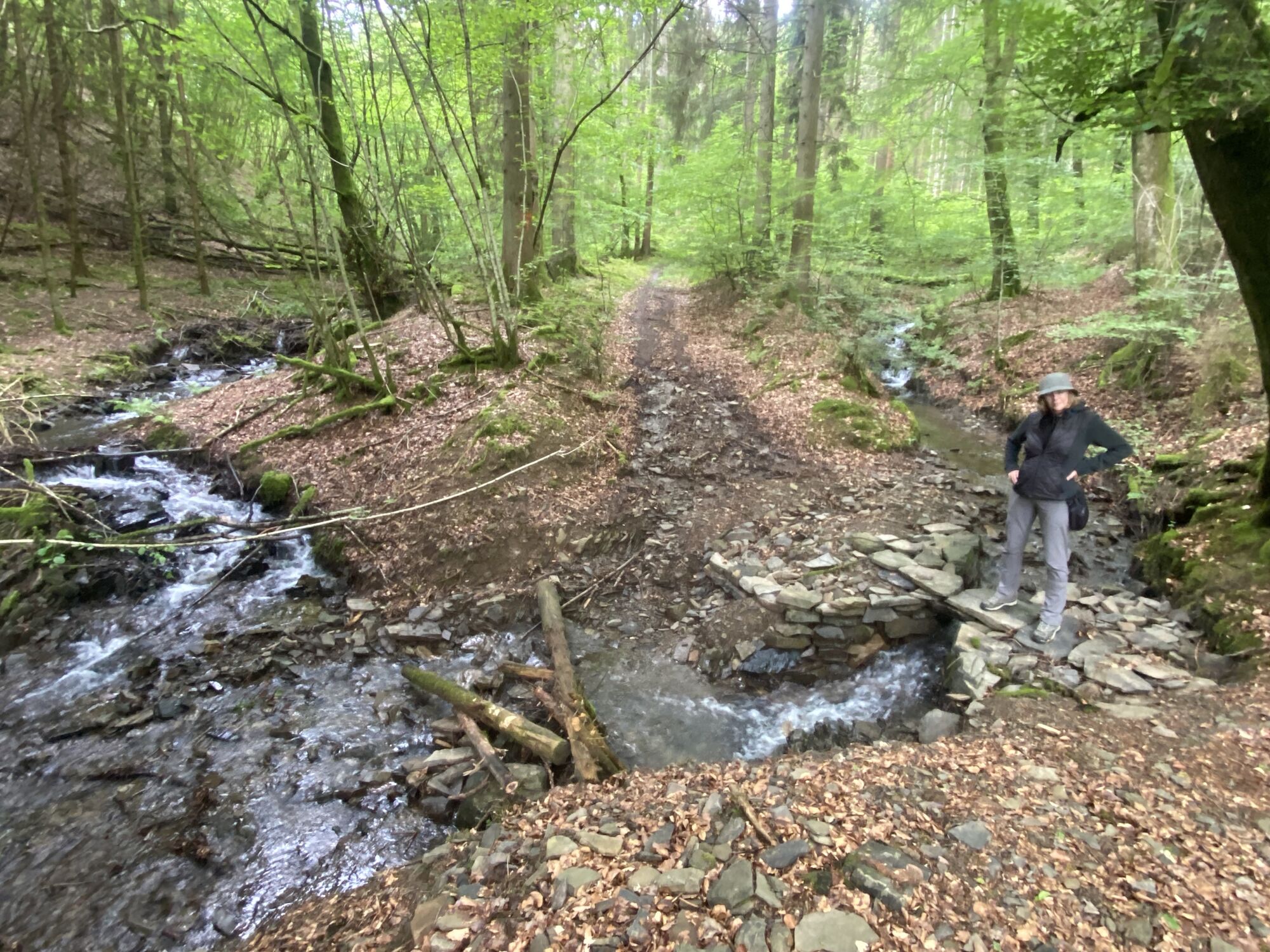 Bergafwaards een beek volgen dan het avontuurlijk pad langs de kam bergop volgen en daarna weer op adem rustig verder wandelen.