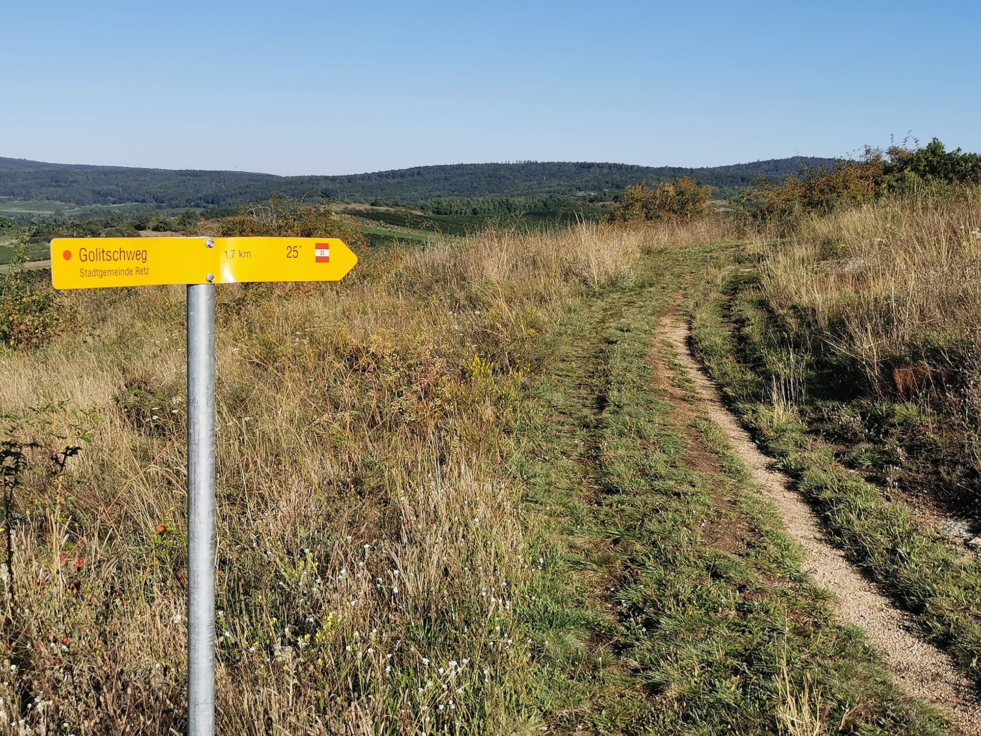Vom Hauptplatz – Stadtbrunnen – wanderst du Richtung Apotheke in die Burggasse und gelangst durch die Hotelanlage Althof über eine Holzbrücke zum Klosterbrückerlweg. Links vorbei an der Dominikanerkirche, verlässt du rechts abbiegend die Stadt und wanderst durch die Weingärten entlang, zum Fuß des Golitsch. Der Hausberg der Retzer bietet dir mit seiner Heidelandschaft mit Trockenrasen (Landschaftsschutzgebiet) eine schöne Aussicht auf die Weinstadt. Vom Aussichtsbankerl führt dich der Weg an der Rückseite des Golitsch zurück zum Klosterbrückerlweg. Zur Einkehr laden der Vinariumheurige im Hotel Althof oder der Stadtheurige Brandstetter in der Vinzenzigasse.