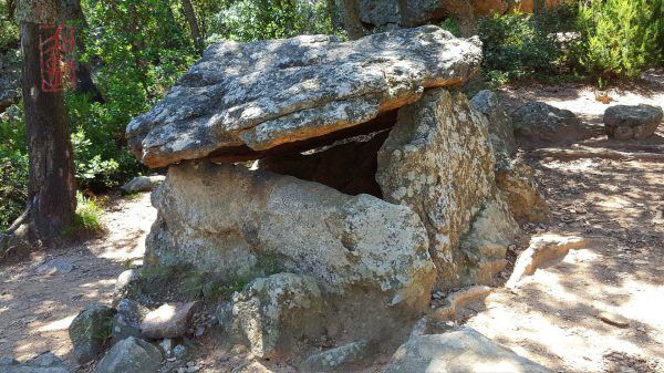 Pursue on a large path and look out on the right the departure of two paths. In direction of the Cova de l’Alarb’ dolmen. Take the path gullied by the runoff of rainwaters. This path goes into the forest with a big difference in height or level. Be careful this area is a wild and there are a lot of pedestrian paths.