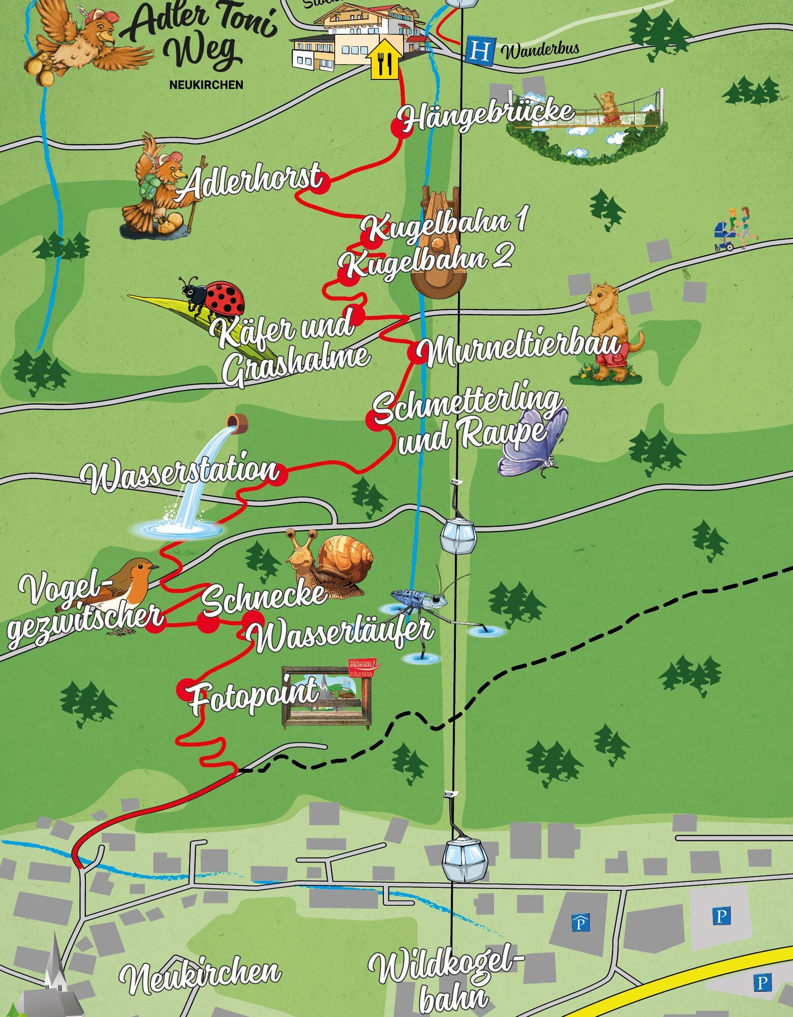 Der Adler Toni Erlebnisweg startet direkt am Alpengasthof Rechtegg - am Ende des Rutschenwegs und führt hinunter ins Ortszentrum von Neukirchen. Entlang des Weges warten neun fantasievolle Erlebnisstationen, die Kinder zum Mitmachen, Staunen und Spielen einladen.