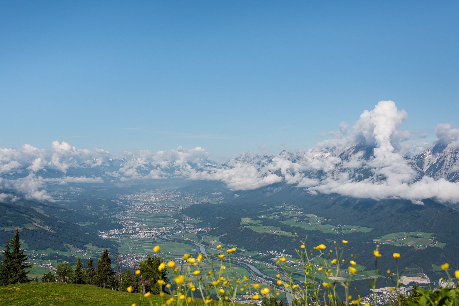 Direkt nach dem Schranken der Liftstation Kellerjochbahn startet die Route an der linken Straßenseite